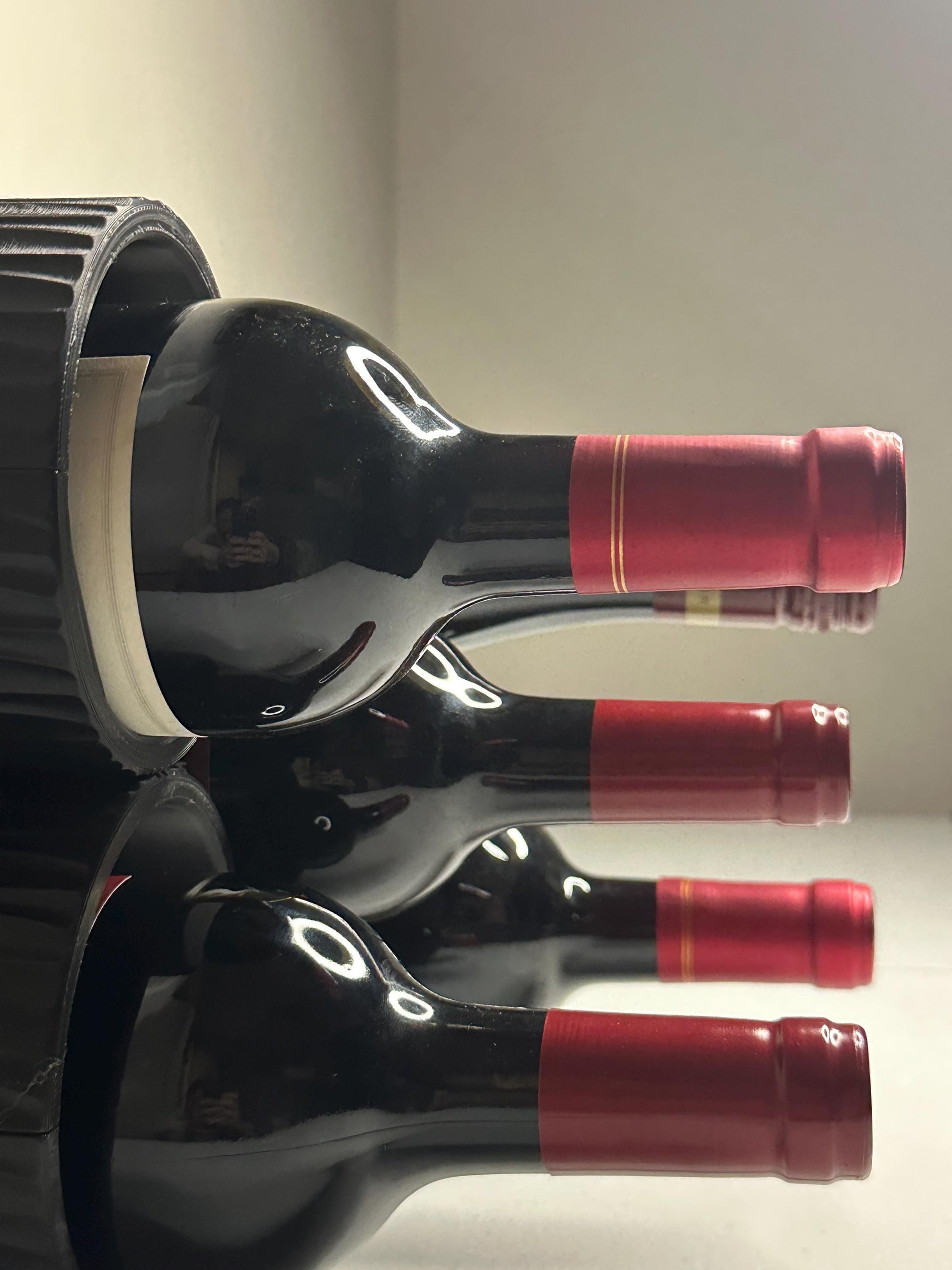 Keep your wine bottles organized in style with this modern 3D printed wine rack. Designed with a sleek black finish and a subtle textured pattern, this rack holds up to 5 standard wine bottles securely while adding a contemporary touch to your home, kitchen, or bar area.